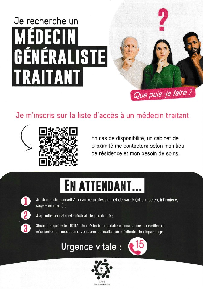 Vous n’avez plus de médecin traitant. Vous pouvez vous inscrire, sur la liste d’attente commune via le QR code de l’image communiquée ou en vous rendant sur le site: https://tinyurl.com/MGT85.