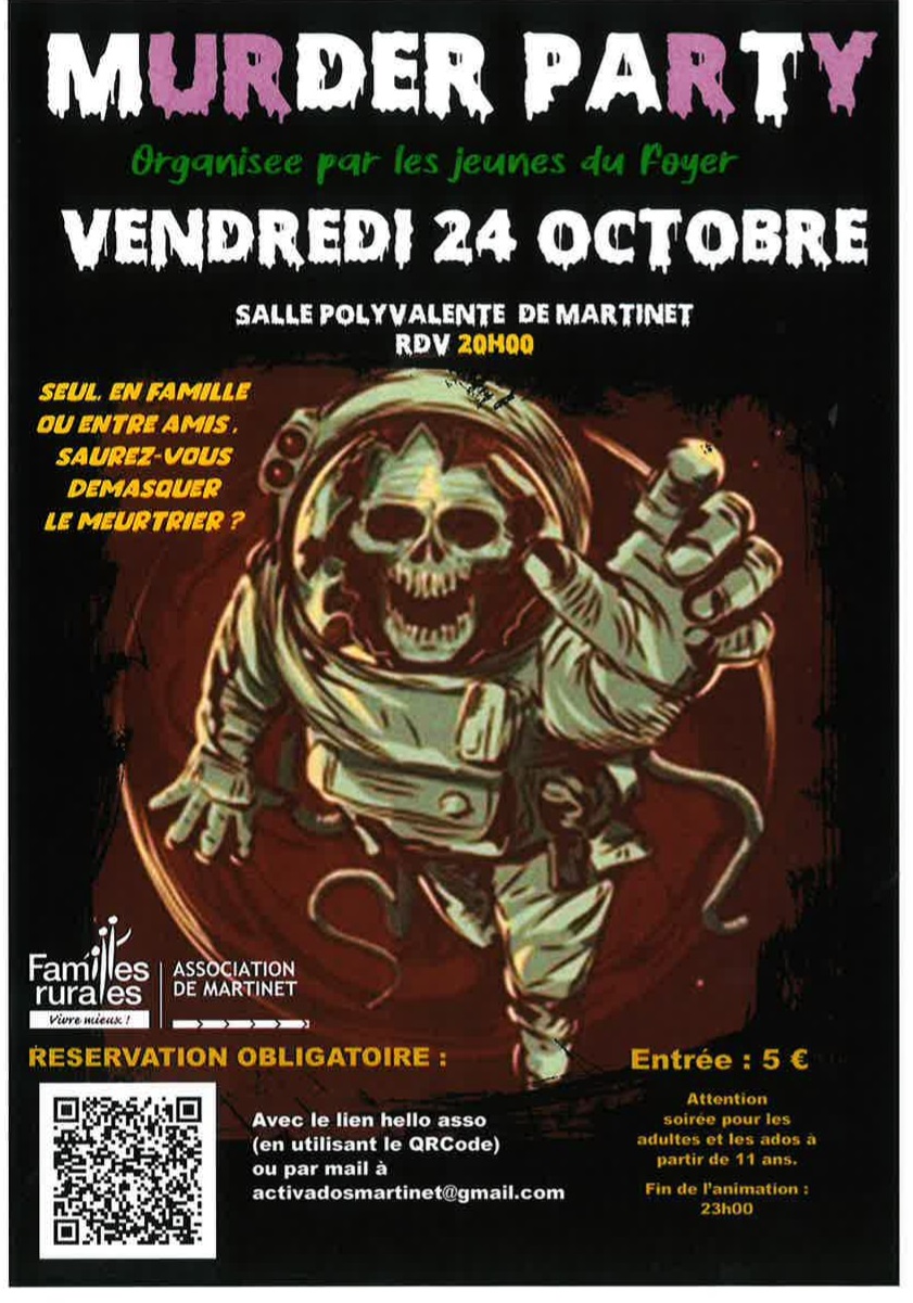 Par internet : https://www.helloasso.com/associations/familles-rurales-martinet/evenements/murder-party-2025